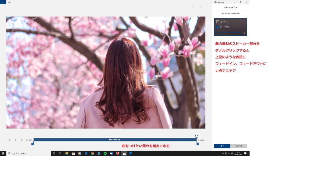 また曲を映像の、どの部分からつけたいか長さも指定できますし、